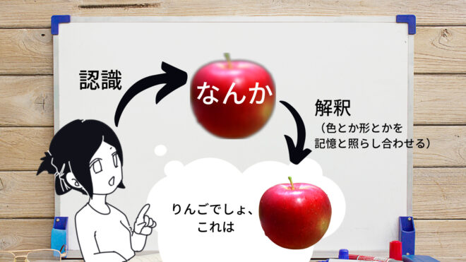 私「りんごっぽい、て思うには、まずは五感を使ってそれを認識する必要があって、で、その情報をもとに自分で考えたりして判断してる……。だからそれはあくまで自分の認識、解釈ってことか」