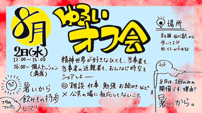 そういう偶然性と自主性が強めなオフ会です。特に出欠を取ったり参加者は事前連絡をお願いしているわけでもないので、私自身当日そのその時になるまで誰がくるかわかりません。誰も来ないかもしれないし、いっぱいくるかもしれないし。参加費も現時点では何も取っていません。フリー。