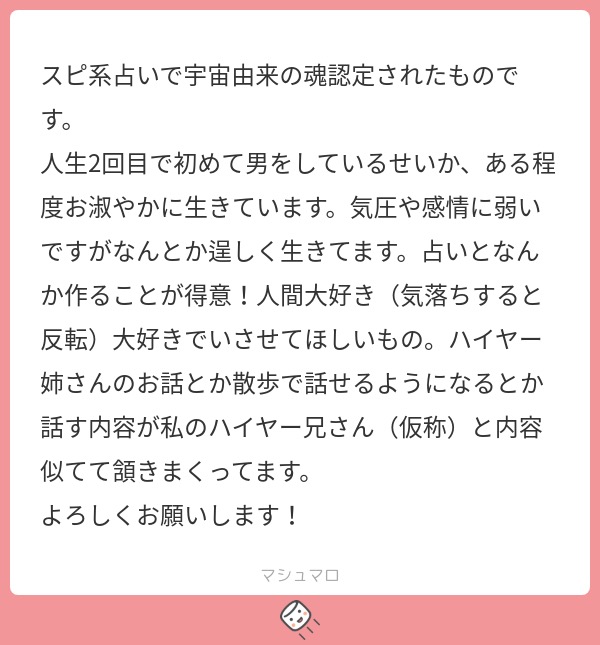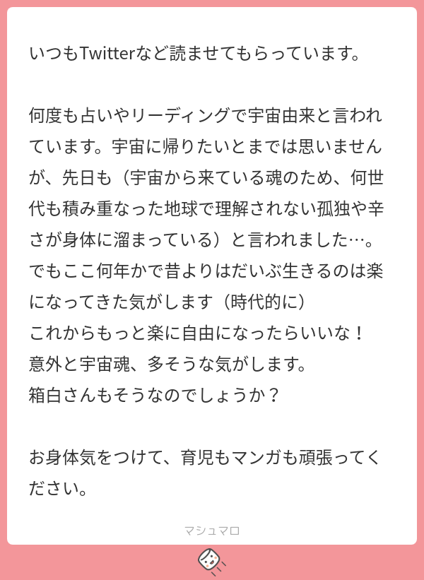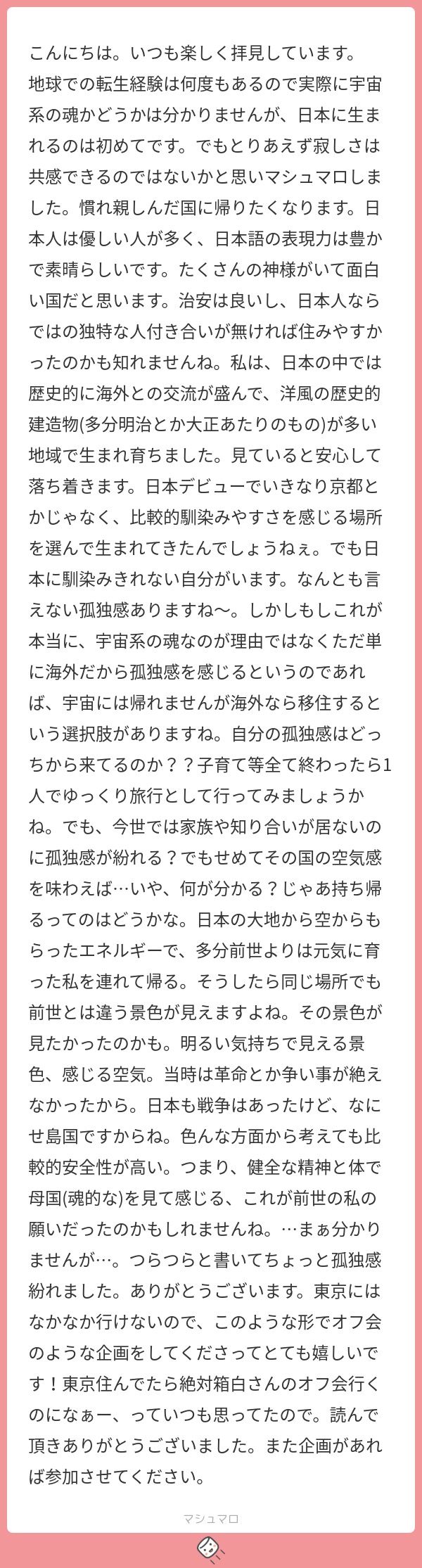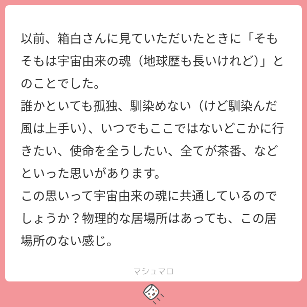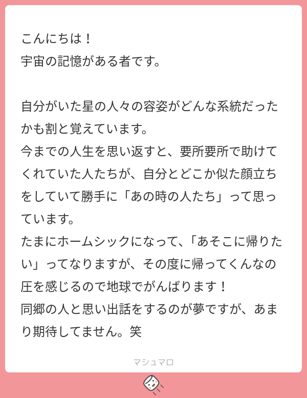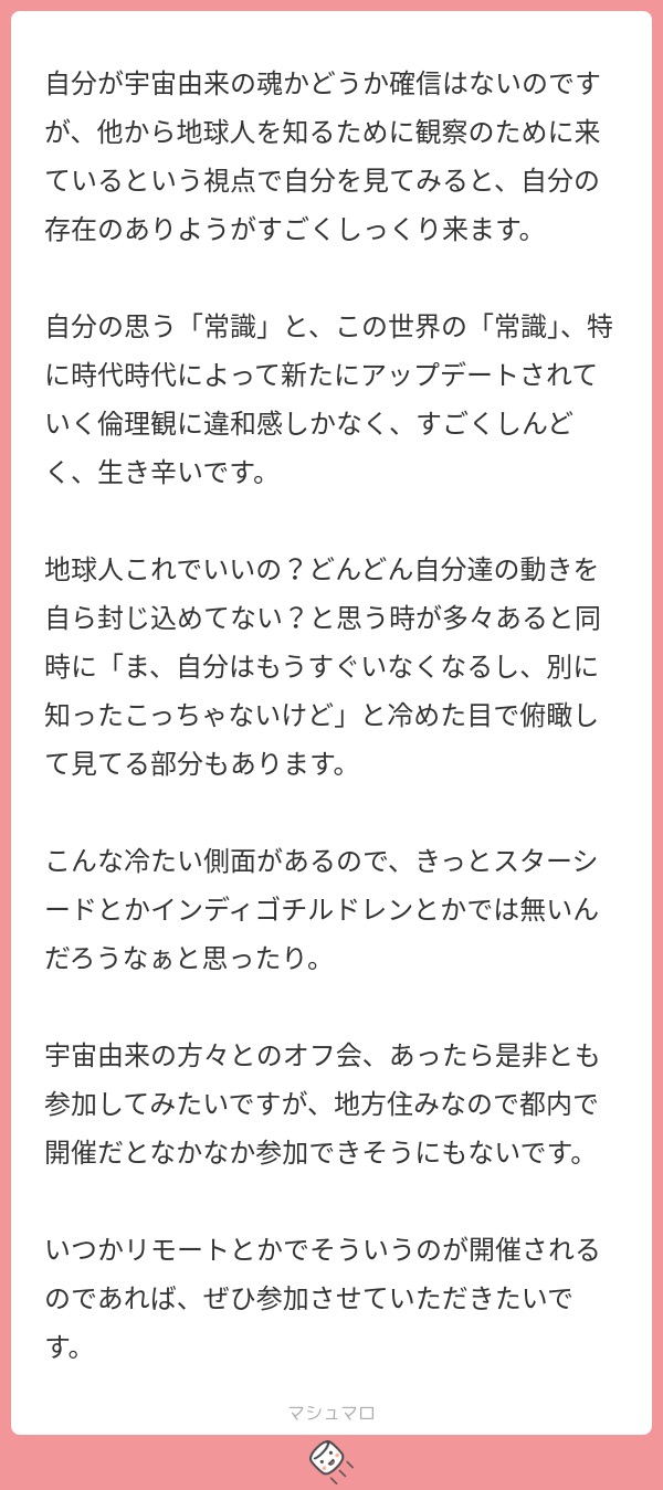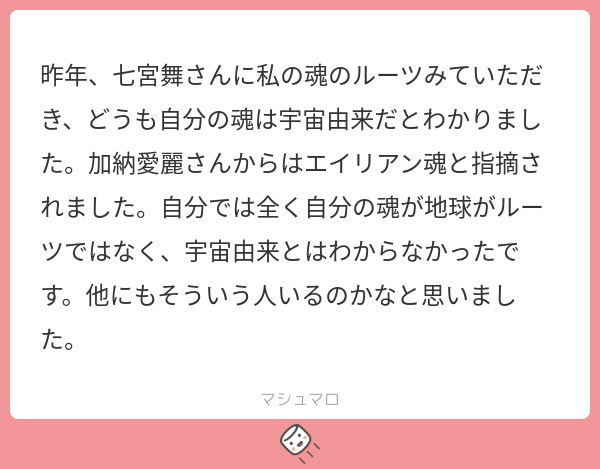 がっつりどこの星かまでわかってる人もいれば、「私はどこから来たんだ?」と覚えていない人まで。「私もそうかもなー」のふんわりテイストの人も含めて、