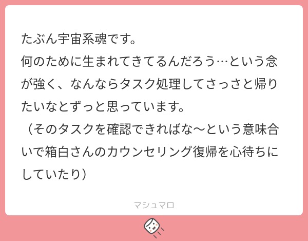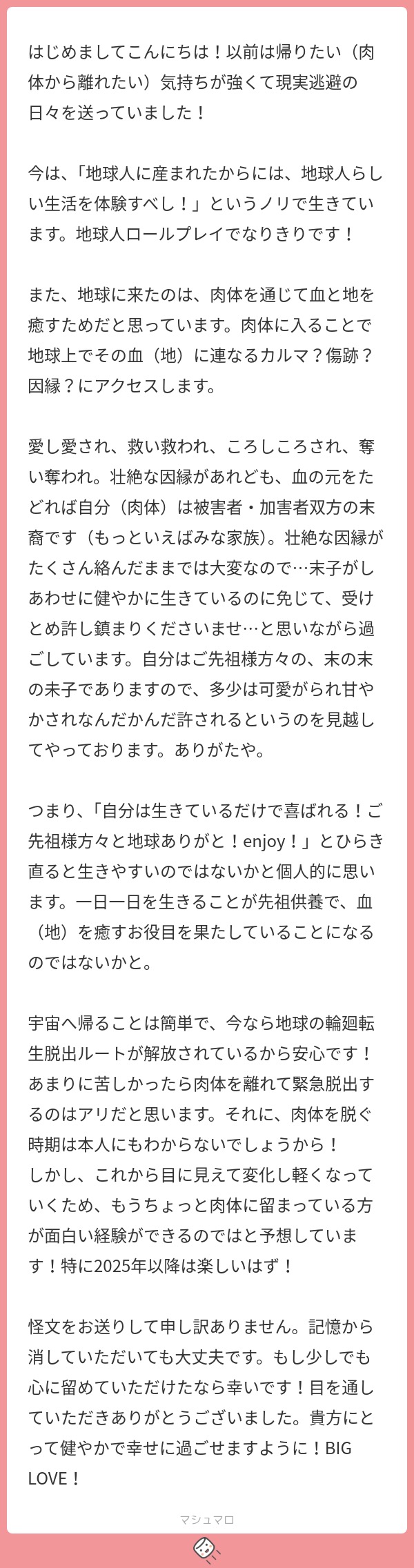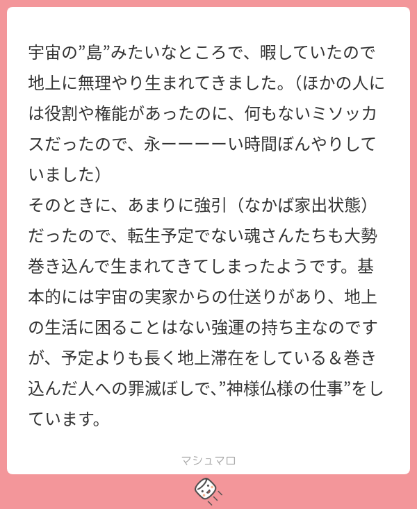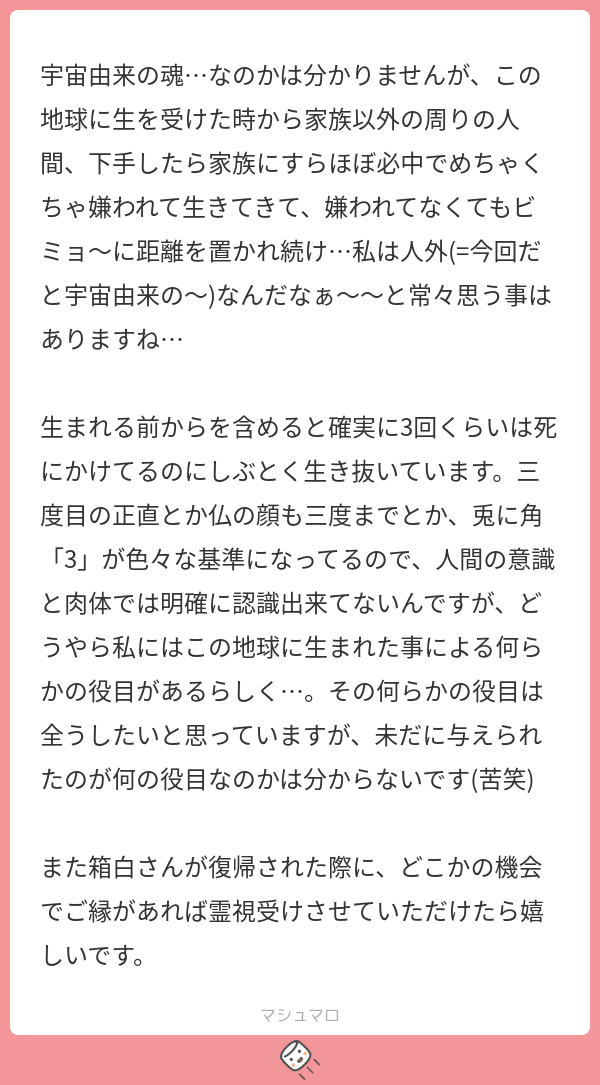 クッッッソきつい苦難であることが多いので、修行目的や仕事のために地球に来ている人に多い印象です。いやあ生き残ってよかった。