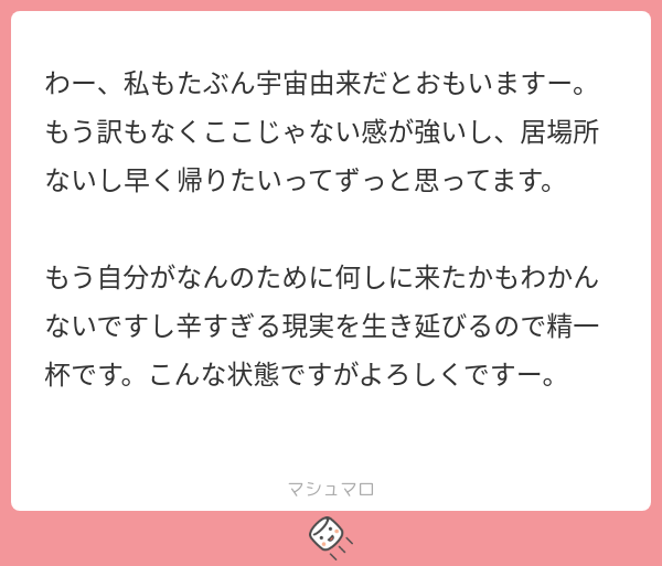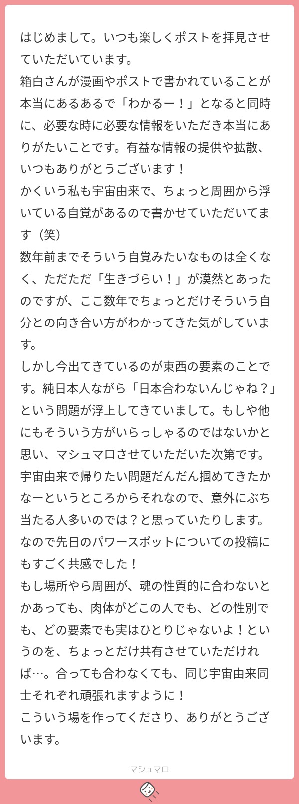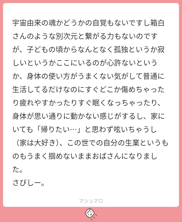 ネットで検索すると「あなたは〇〇星人」とかよく書いてあるけど、いやいや、当事者が欲しいのはそこから先の情報なんだよ!!どこ星人でも良いけど、とにかくこの現世への違和感強い問題と孤独感をなんとかしてくれ!!
