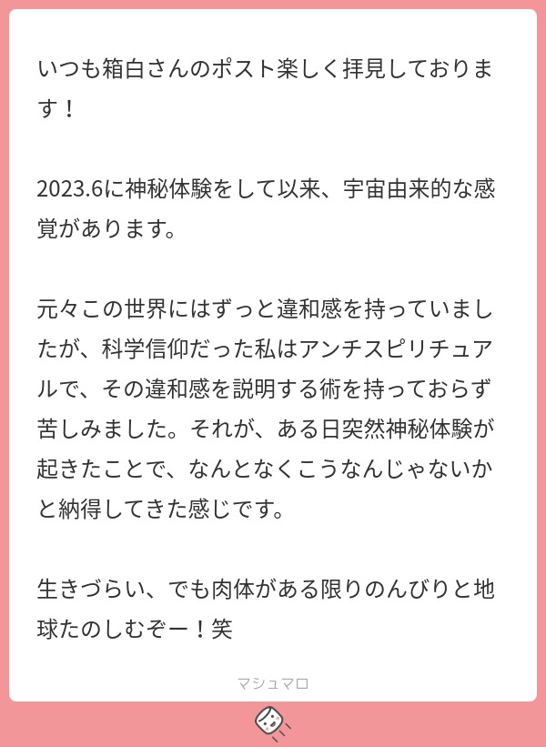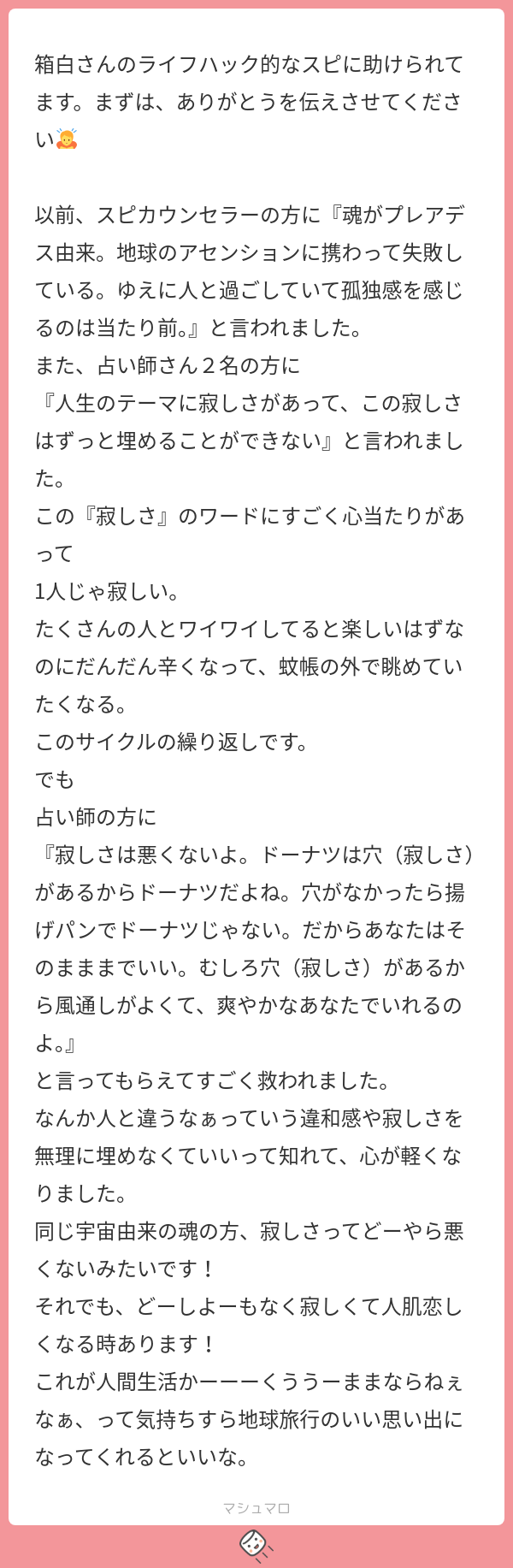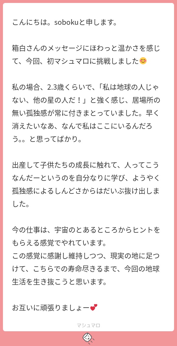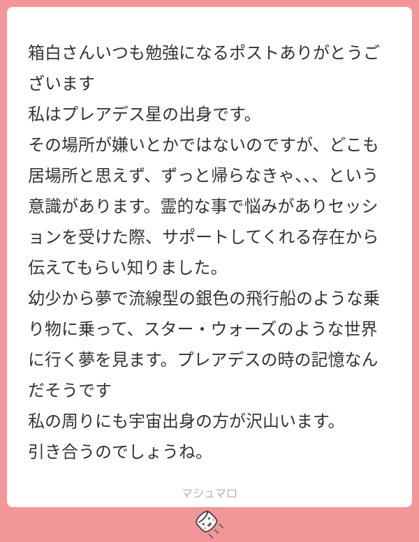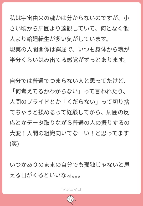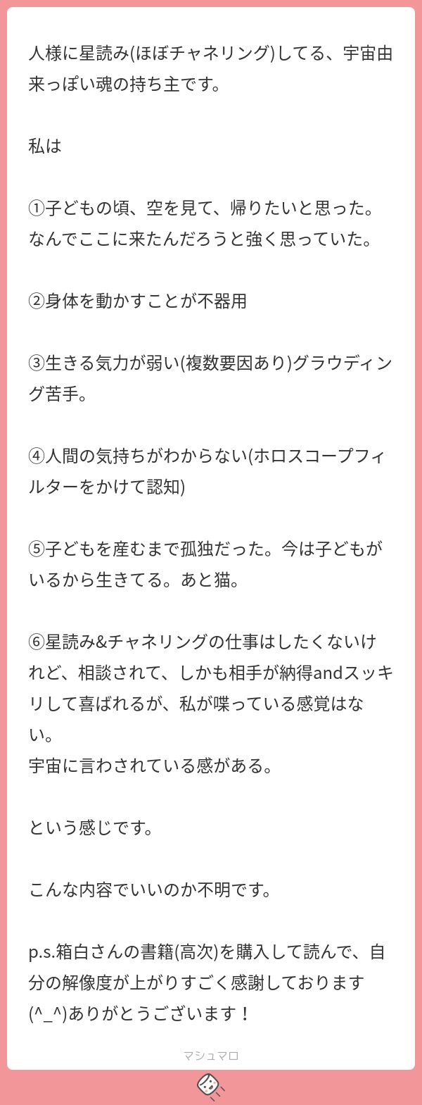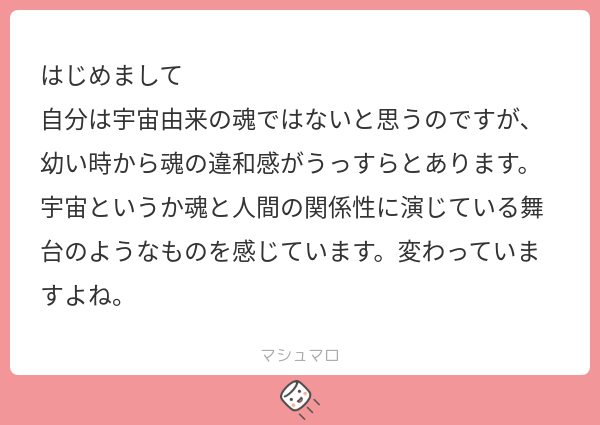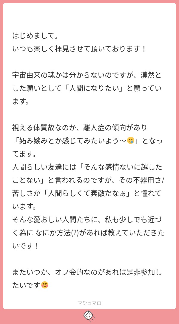 宇宙由来の魂さんでも、「故郷の星の記憶があります」って人から「記憶とかないけど、でも自分を宇宙人って思った方が腑に落ちる」って人、「他人から、あなた宇宙由来でしょって言われて初めて気づいた!私ってちょっと変なのか!笑」って人まで、体感や自覚レベルは人によって違います。
