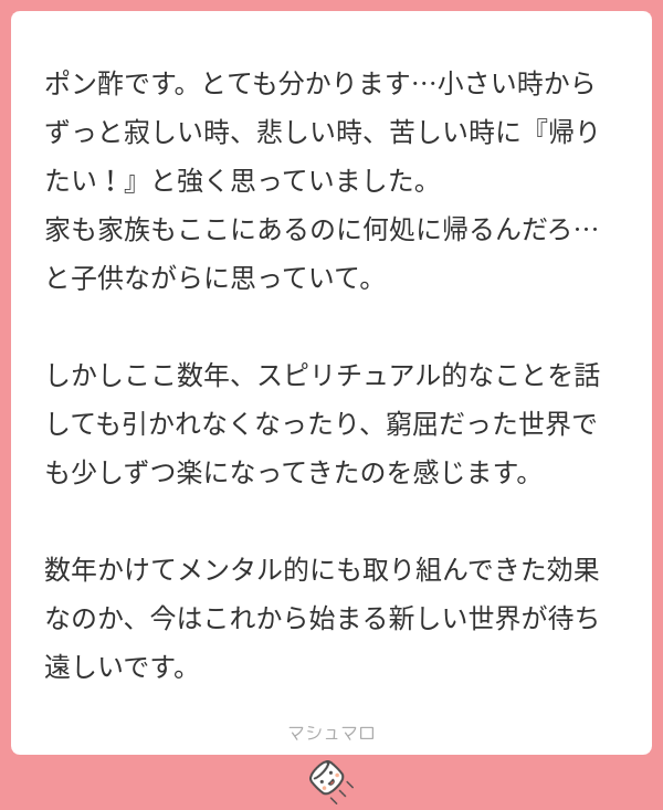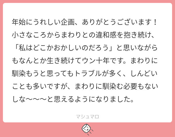 100%まるっと理解し合える人なんていない。孤独は孤独です。でも、少しずつ部分的に理解し合える人が数人、身近にいる。孤独だけど寂しくない。居場所がないなら自分で作ればいい。そのようにできるようになったことへ、心の底から幸福と感謝を感じます。