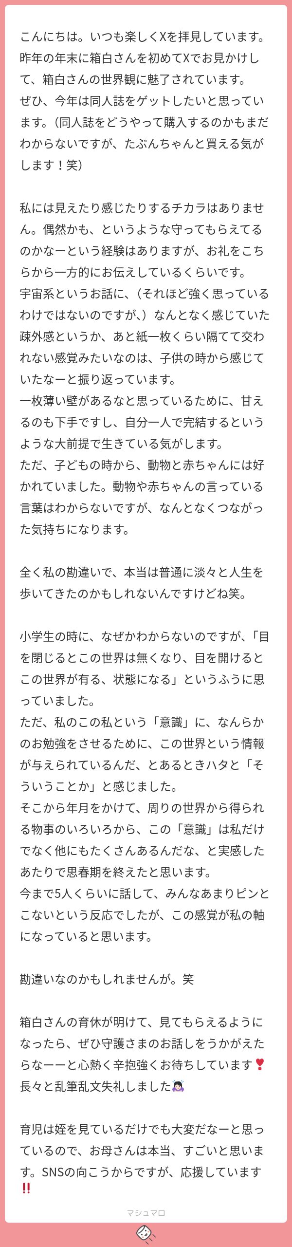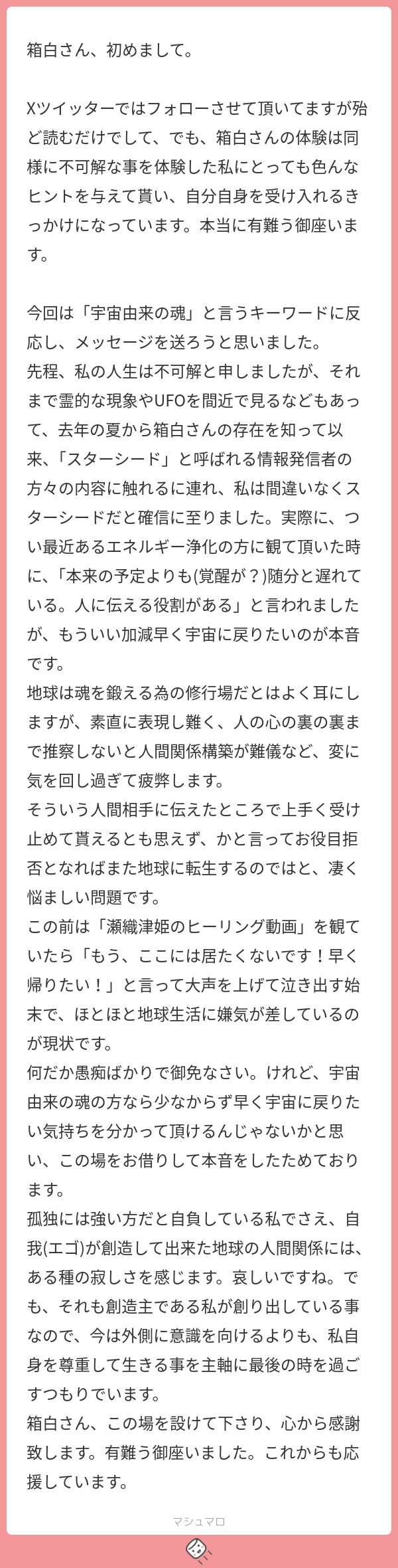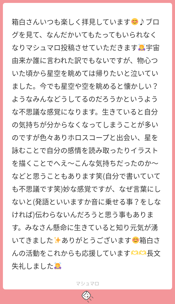 これ、マシュマロを送ってくれた人だけでこんなにいるってことですから。サイレントで見てる人の中にいると思うと、この倍以上は宇宙由来さんいるんじゃない?